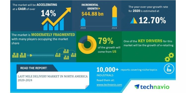 LONDON–(BUSINESS WIRE)–Technavio has been monitoring the last mile delivery market in North America since 2018 and the market is poised to grow by USD 44.88 billion during 2020-2024, progressing at a CAGR of over 14% during the forecast period. Request Free Sample Pages