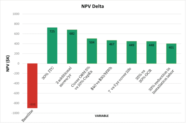 The third-highest NPV is the material ground cover O&M. Here, we adjusted the operating expense from 10% to 5% of total CapEx per year. We lack operating cost tools and experience to provide a confident cost for this item, but we believe an opportunity exists to adjust it down to 5%.
