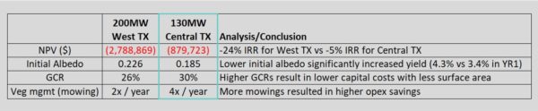 We started the project net present value (NPV) analysis on our Taygete II project, which is currently under construction in West Texas. Project details included 1.29DC/AC ratio, 0.226 measured average ground albedo, 0.26% ground coverage ratio (GCR), and 1 in portrait orientation single axis tracker. Below is the summary of the financial NPV modeling for the project.