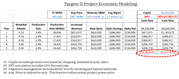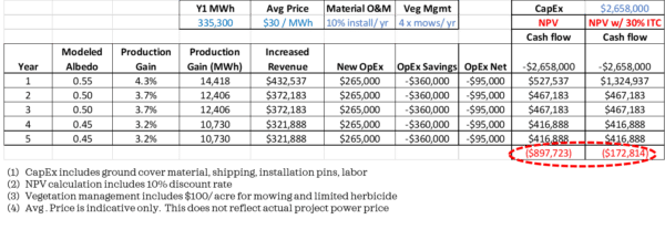 We also adjusted the modeled albedo as we expected the material to show a reflectivity reduction as the material aged and broke down. The resultant production gains were multiplied by the indicative modeled price ($30/MWh) to show increased revenue. Then, we added additional budget to the operational expense since we expected some wear and tear from maintenance techs, weather, and so on. We also assumed the annual expenses at 10% of the total capital cost for the material. And last, we included operational savings from the reduction of vegetation management due to the ground cover.