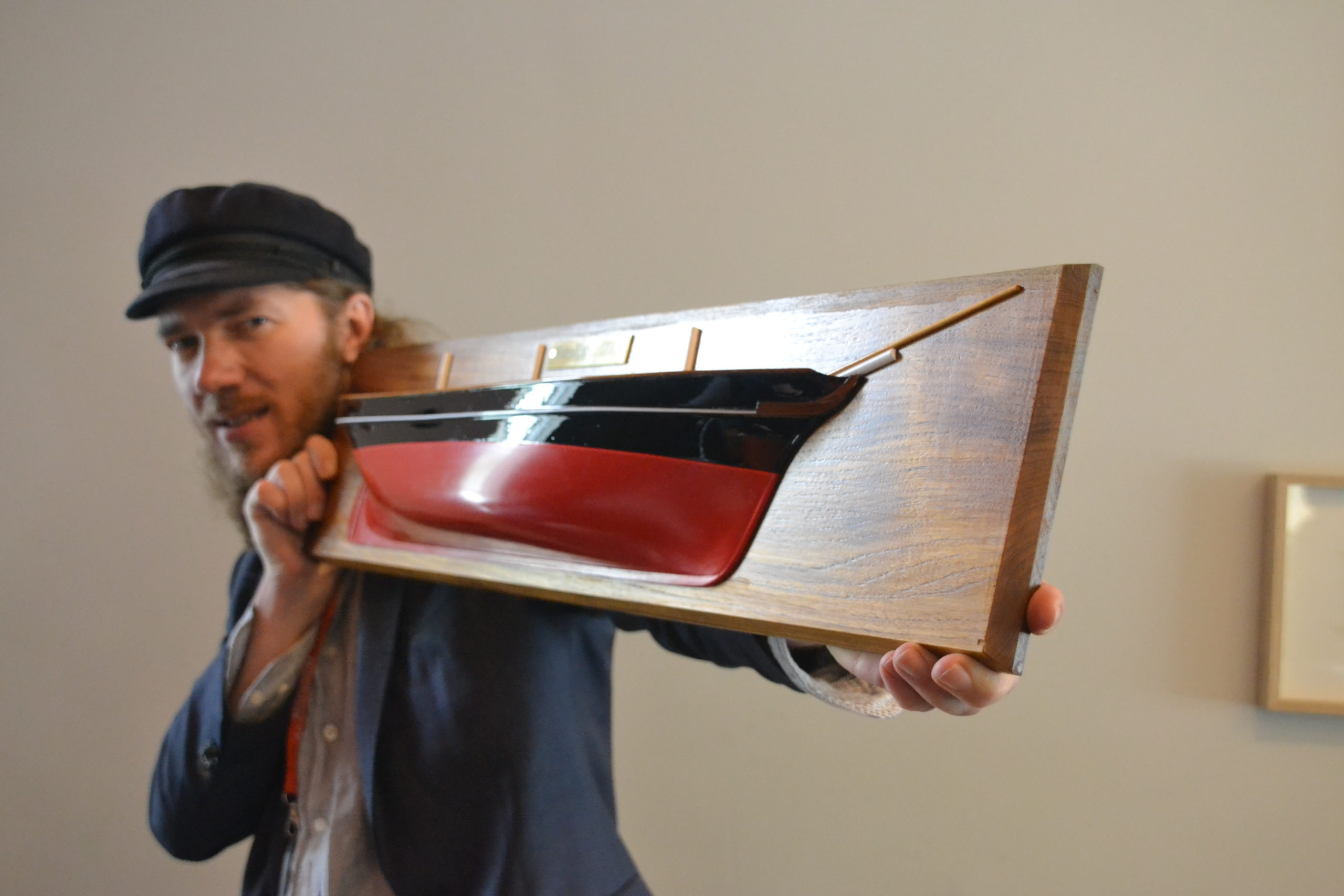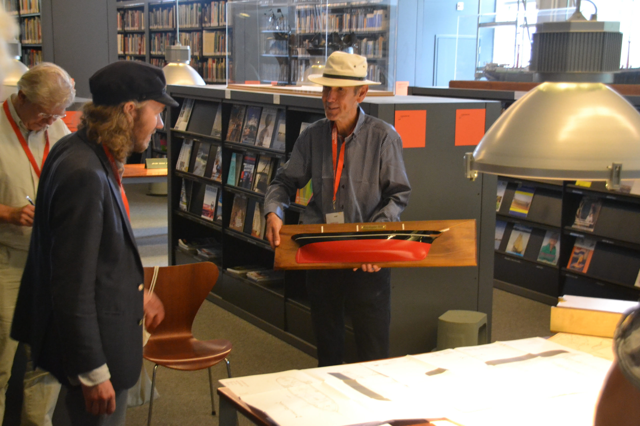 Leo Boogerd handing over the half model of EcoClipper500 prototype to Jorne Langelaan, founder of EcoClipper, in the maritime museum of Rotterdam