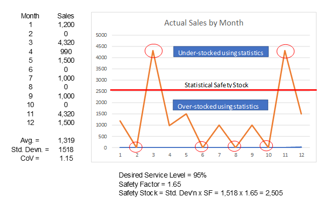 The CoV test indicates bell curve statistical techniques are not valid in this case. CoV is greater than 1.0. If statistical safety stock is used, both over-stocks and stock-outs will occur. In that case, the best solution is to place it on a make-to-order policy. However, if the customer insists on the supplier keeping some stock, the best solution would be to maintain a minimum safety stock of 1,500 units. This covers demand for ten of the twelve months. For the two months when demand far exceeds average, the options are advance warning from the customer, expediting by the supplier or longer delivery lead time.