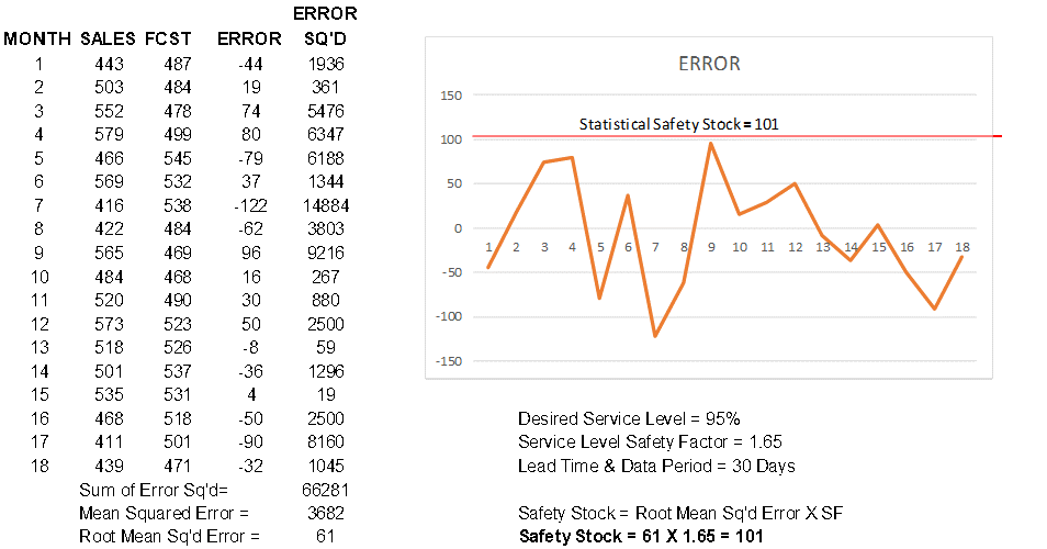 Another key link in planning is the use of the demand variance or forecast error to plan safety stock levels. The use of subjective safety stocks by ordering early is common in industry. This judgment model for determining safety stock quantity leads to high inventory. Below is an example of using forecast error to set safety stock levels.