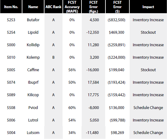 A good practice is to link forecast performance to inventory and service. The “Top Ten” report below is reviewed in the S&OP Meeting each month.