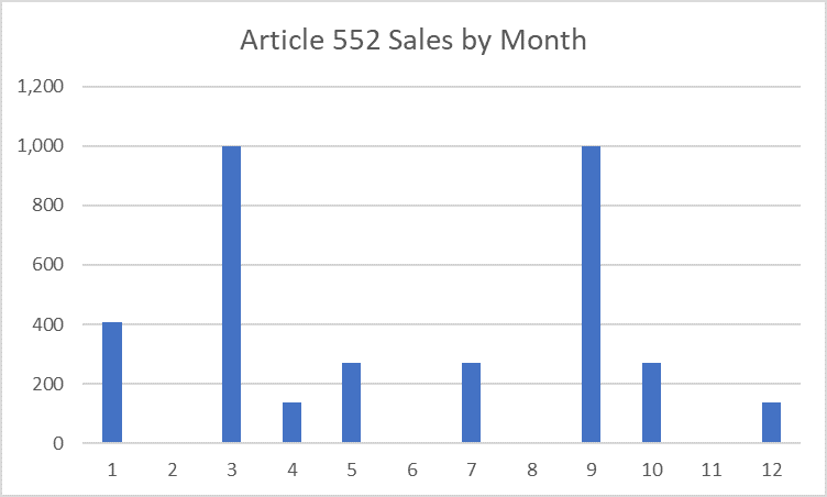 Notice Article 551 in Table 2 has both high volume and high variance in demand. Collaboration with the customer resulted in a stocking policy to ensure product availability at the point of order. Here the customer provided an order schedule. In this case Article 552 was being forecasted using a 3-month moving average. The result was being out of stock in some months and having excess inventory in others. Chart 3 depicts the actual demand for this article.