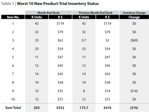 We all know the story regarding new products. Sales and Marketing are conditioned to over-forecast these in most cases. In their view it is much better to create excess inventory than to risk a loss of revenue. Of course, in most units Sales & Marketing are not held responsible for inventory levels or dysfunctional inventories. Supply Chain is accountable for inventory performance, but this responsibility does not usually address new product introductions in a timely manner. Often excess and aged inventories result from lower than expected demands for new products. Several years ago, a business unit with poor inventory performance got a new leader. When discussing this with the Supply Chain leader, he was told that new product and trial inventory was over $500,000. He directed the Supply Chain manager to add this inventory performance to the monthly report reviewed in the S&OP meeting. Table 1 depicts an example of the report, along with comments.