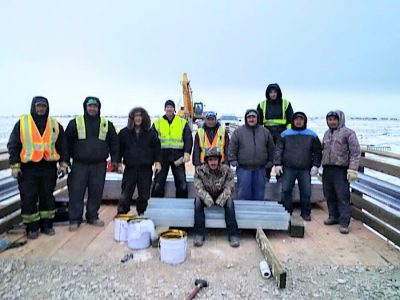 Workers from Sudliq Developments Ltd. in Coral Harbour work on a 2016 bridge project outside the Kivalliq community. This year, Sudliq, an Inuit-owned company, did not get a chance to bid on another bridge contract, although it did receive a subcontract for the labour portion of the 2020 contract (Photo courtesy of Dino Bruce)