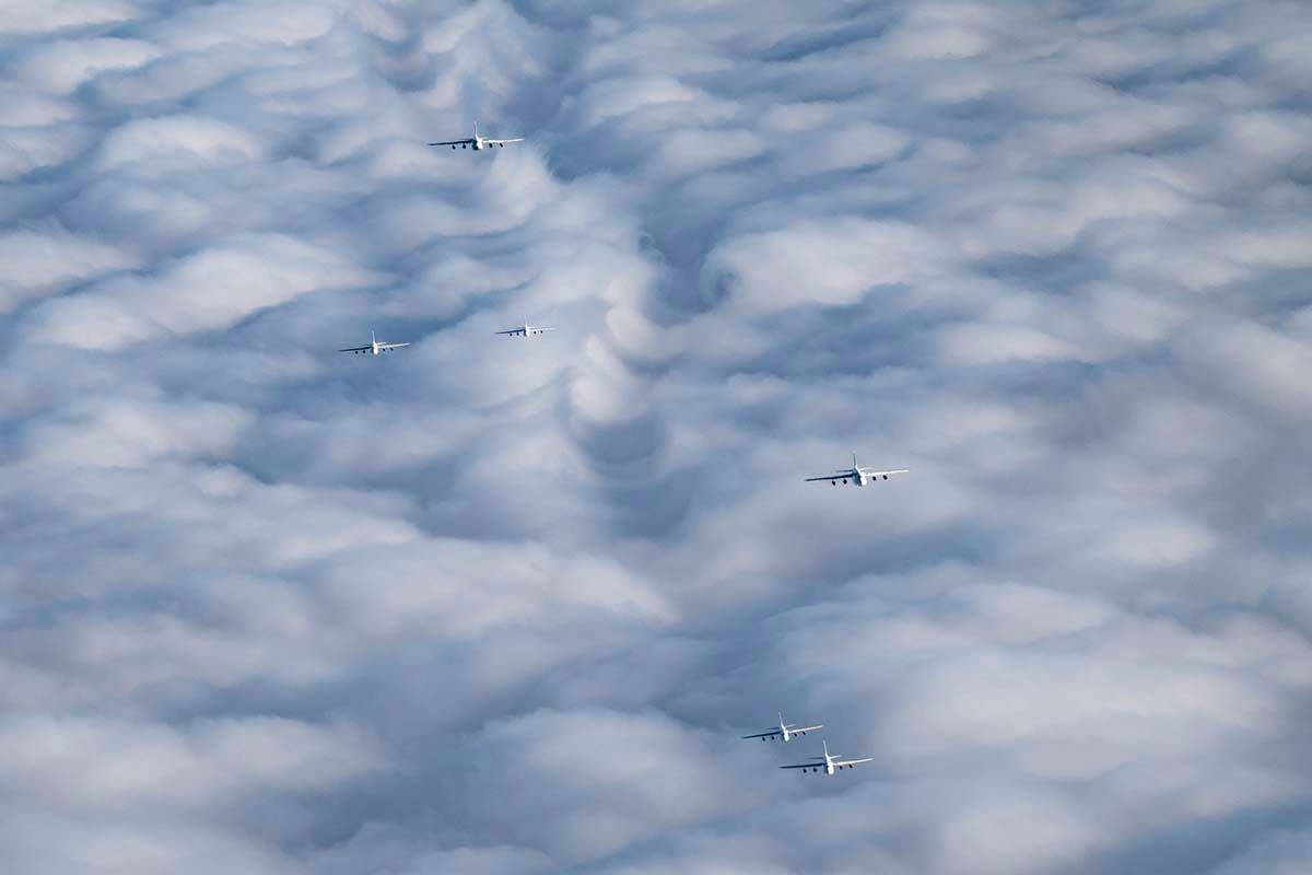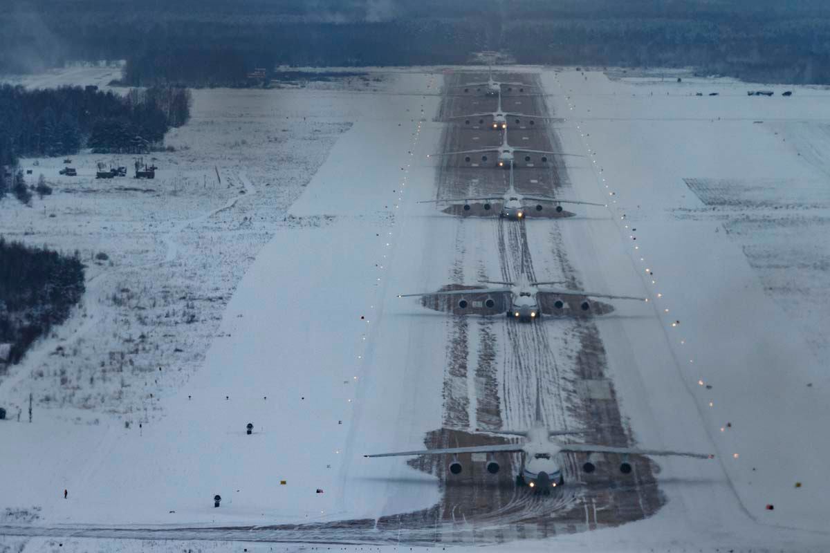 For the first time, the Russian Air Force has conducted a mass launch of 6 AN-124 (Nato reporting name Condor) cargo aircraft, practicing the combat capability of safely and swiftly launching a large number of heavy aircraft.
