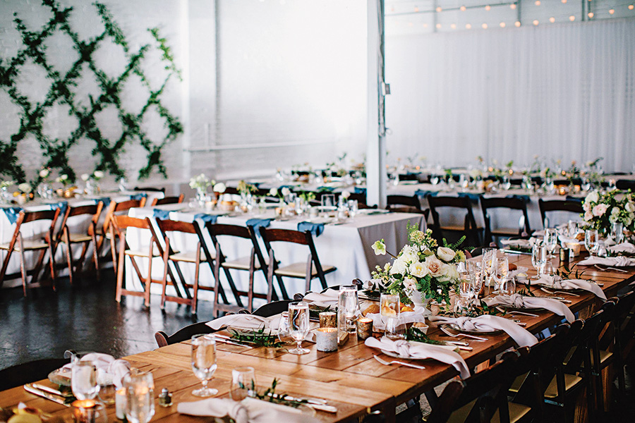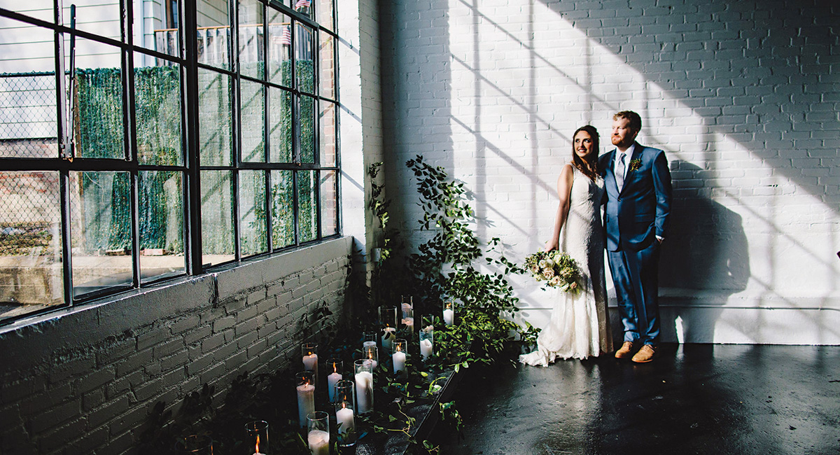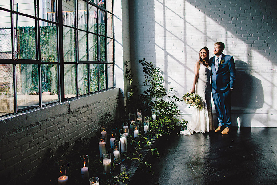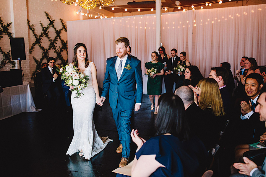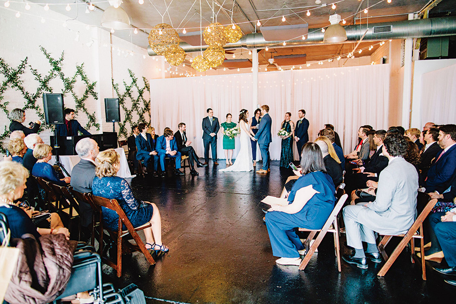When the pair began planning their nuptials just over three years later, they fell head-over-heels for Warehouse XI—a 3,225-square-foot event space in Union Square. With painted brick walls and oversize windows, the venue was a perfect match for the industrial vibe they craved. The icing on the cake? Warehouse XI sits near the border of Cambridge and Somerville, the couple’s adopted hometowns. “We both lived within blocks of the venue for years,” the bride says, “so it felt meaningful.”