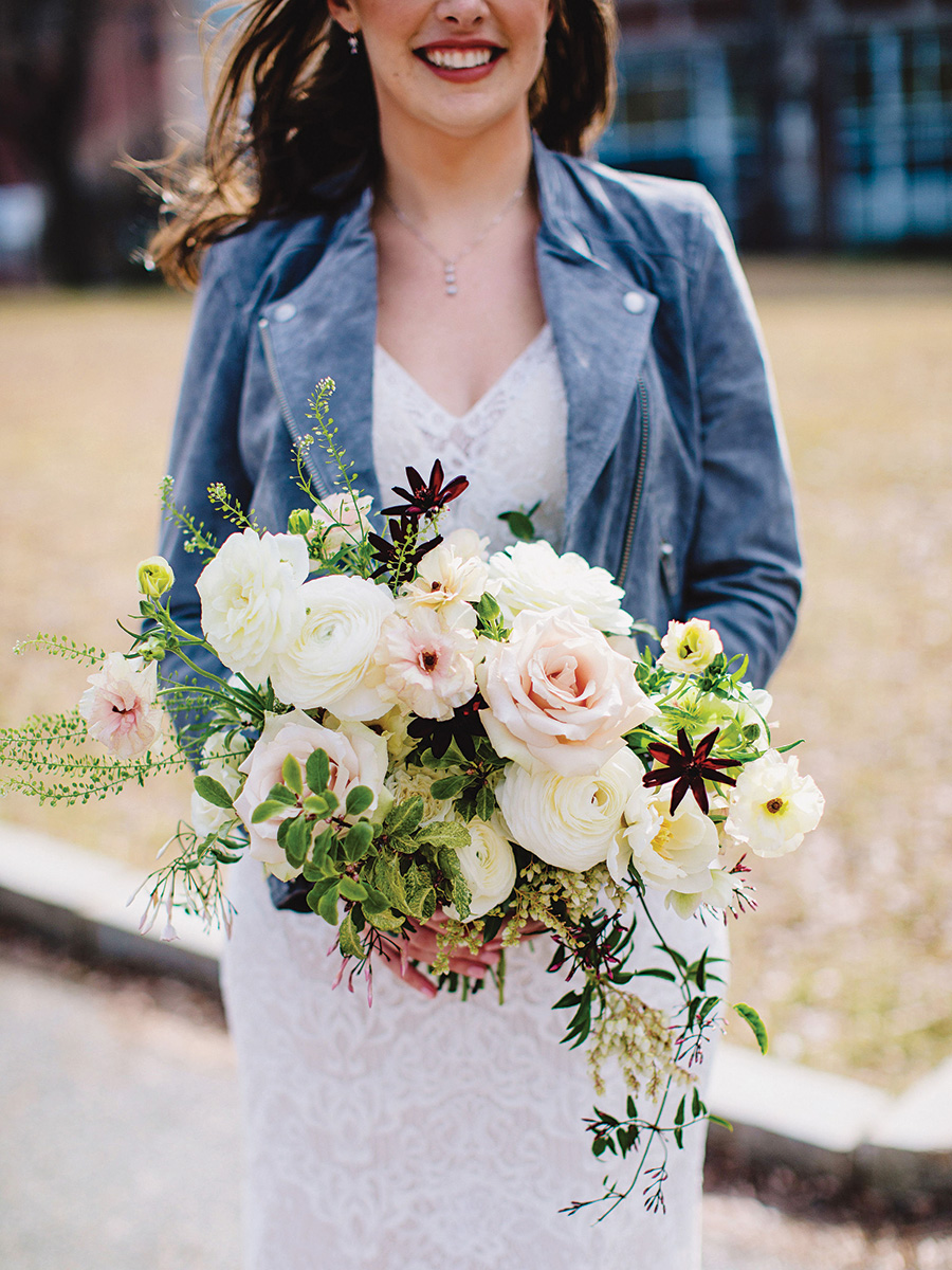 The bride’s free-flowing bouquet featured seasonal blooms such as ranunculus, hellebore, and chocolate cosmo. “I wanted something that looked like it came out of a garden,” she says.