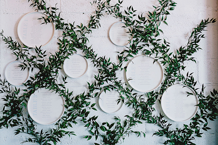Drawing inspiration from a garden trellis, florist Twig + Briar used greenery to dress up the venue’s walls—one of which was used as the backdrop for the circular seating charts and, later, the couple’s photo booth.
