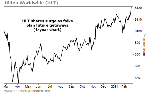 As you can see, HLT shares have soared. They’re up nearly 110% since last year’s lows… And they recently hit a fresh all-time high. Investors are betting that the travel industry’s woes won’t last forever…