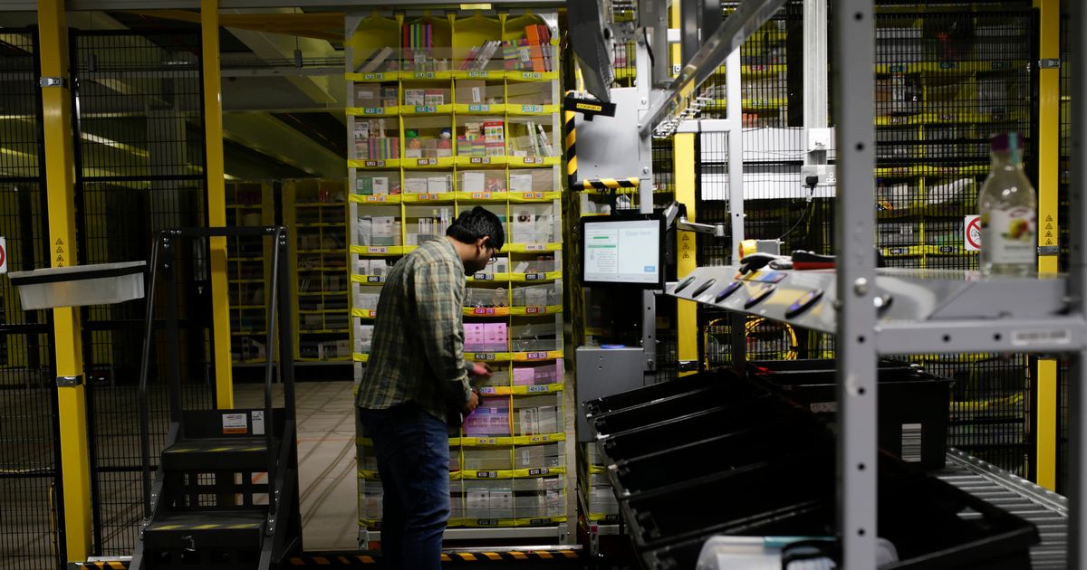 An Amazon worker places products into one of the warehouse’s many robotic shelves